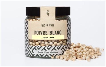 Poivre blanc bio du Sri Lanka. Qualité premium, doublement trié, sans pépins foncés et au délicat arôme poivré.